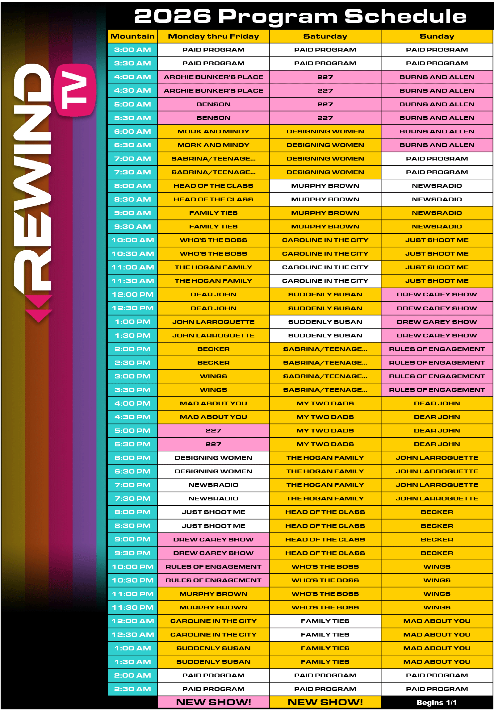 Mountain Schedule East-West ScheduleEastern ScheduleCentral ScheduleMountain SchedulePacific ScheduleHawaii ScheduleAlaska Schedule Download Mountain Schedule Channel Finder ENTER ZIP CODE Follow Us